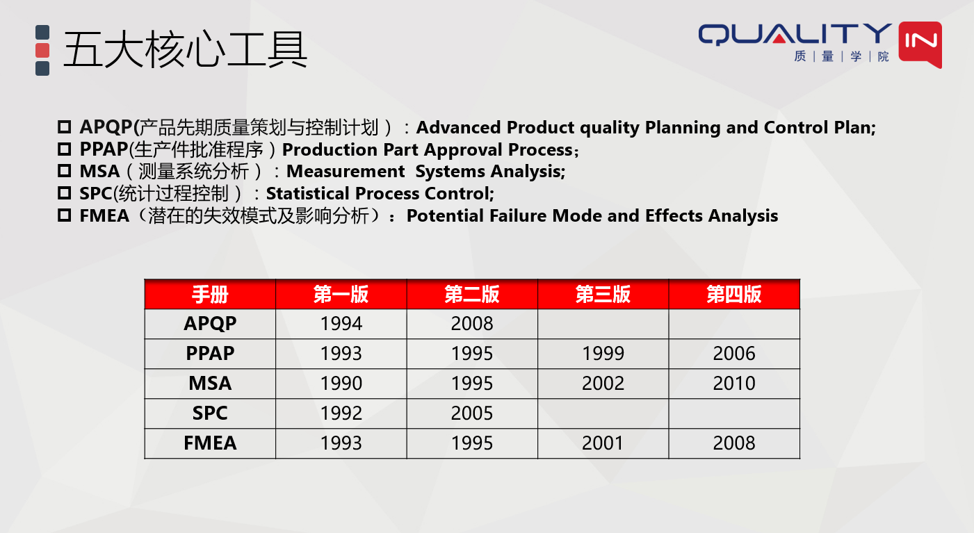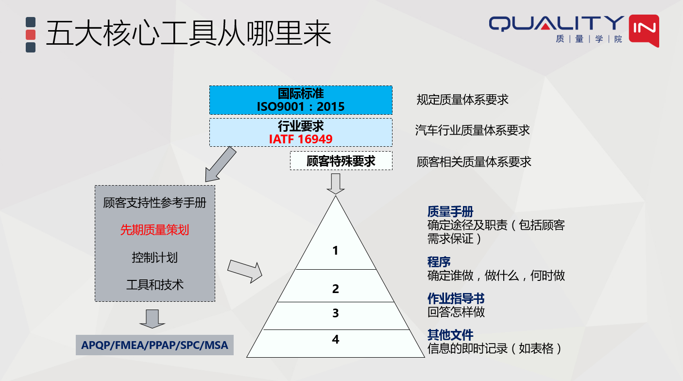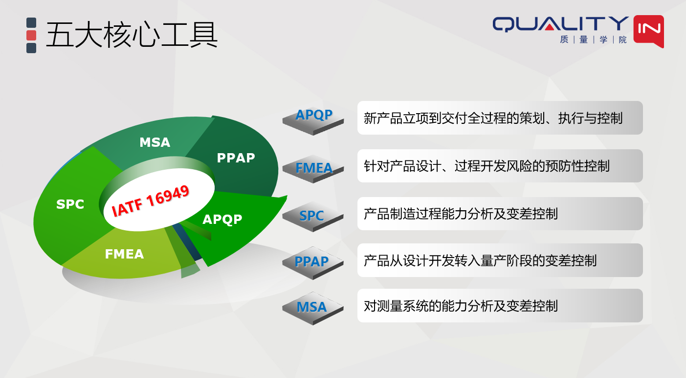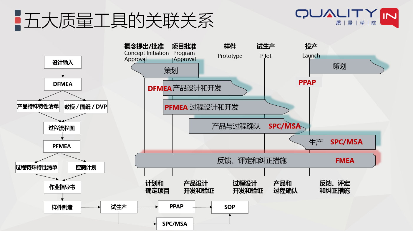 一张图搞懂IATF16949中的五大核心工具间的关系发表时间:2022-04-25 22:05 干货|一张图搞懂IATF16949中的五大核心工具间的关系前言 汽车行业的5大核心工具一直是制造企业极力推崇的质量管理工具,但是很多企业并没有真正的搞懂这些工具之间的关系,往往是知其然不知其所以然,导致核心工具的运用做样子的多,有效运用的少。 一、五大核心工具从哪里来 首先,我们了解一下什么是五大核心工具,以及最新核心工具手册的版本: ![]() 它们从哪里来?其实五大核心工具是汽车行业主机厂基于行业最佳实践总结出来的,现在比较典型的是美国汽车工业协会(AIAG)总结的五大核心手册。 ![]() 二、五大核心工具的目的和作用 这五大工具的核心目的和作用是什么呢: ![]() 从上图可以看出五大核心工具围绕着汽车行业的质量管理体系标准,有着各自不同的作用和目的,但它们之间有有着密不可分的联系。 三、五大核心工具之间的关系 要想搞清楚这些核心工具之间的关系,我们必须先了解APQP。 『 APQP是组织将顾客的需求从概念变成实物产品的结构化过程。所谓结构化就是将其运作过程分成若干阶段,然后在每个阶段都定义出要做的事情以及控制的方法。这个是要事前策划出来,不能走一步看一步,每个阶段的任务结果都要满足要求,否则问题会全部积累到量产阶段,甚至在产品上市后爆发。』 下图展示了APQP的结构,包括阶段及关键里程碑的定义。 ![]() APQP就像我们人体的骨架,支撑和串联起所有核心工具的运作。其它的核心工具在这个结构性方法的支撑下,在不同阶段,起着不同的作用。如下图所示: ![]() 从上图我们可以看到,在开始着手进行产品设计前先要进行DFMEA的分析,这样才能确保提前识别产品设计的风险以及产品设计控制的风险,并基于对风险的分析和评价,决定设计及设计控制的措施。 同样,在工艺过程开发之前要先进行PFMEA的分析,识别过程的风险,并基于风险分析及评价的结果决定过程控制措施。我们很多预防性的控制方法(防错设计)其实都可以从FMEA中找到来源。 FMEA是典型的基于风险思维的预防性质量控制工具,如果我们等到设计开发完成之后再去补做,那就完全失去其意义了。同时,FMEA的开发也为后续的SPC和MSA提供了重要的输入。