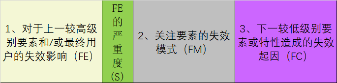 步骤四:失效分析 对于DFMEA,关注要素的概念确定了分析的重点。 1.潜在失效模式变更为:关注要素的失效模式(FM) 2.潜在失效影响变更为:对上一较高级别要素和/或最终用户的失效影响(FE) 3.潜在失效原因变更为:下一较低级别要素或特性的失效起因(FC) 4.各列顺序从FM、FE、FC变更为FE、FM、FC 注释:虽然各列顺序己发生变更,但使用电子表格创建分析的顺序保持不变。首先需要确定(FM),然后由团队确定(FE)或(FC)。当使用FMEA专用软件时,团队可采用不同的方式执行 DFMEA,例如,确定失效,然后在(FE)、(FM)、(FC)的适当失效链中将其联系起来。