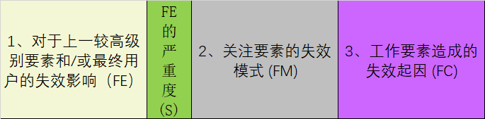 PS:第三栏中手册写的是"下一较低级别要素或特性的失效起因",英文是Failure cause of the next lower element orcharacteristic。但笔者认为该翻译可能会造成误解,所以在上面表格中以及其它的文章中,将中文翻译改为"下一较低级别要素或特性造成的失效起因"。下方PFMEA表格亦然。 1.对于PFMEA,潜在失效影响已变更为上一较高级别要素和/或车辆最终用户的失效影响(FE) 2.严重度已变更为FE的严重度(S) 注:AIAG严重度表基于对顾客及制造的影响,而AIAG&VDA严重度表则基于最终用户的影响,它将对制造的影响分为两部分:对工厂的影响和对发运至工厂的影响(已知悉时) 变更原因:制造业的分工要求用户考虑对制造业的内部影响和外部影响 3.潜在失效模式已更改为关注要素的失效模式(FM)。 4.潜在失效起因已变更为工作要素的失效起因(FC)。