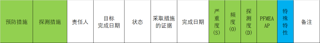 步骤六:优化 1.建议措施已变更为”预防措施和探测措施” 变更原因:信息的划分有助于用户可视化管理与预防和探测相关的措施 2.责任及目标完成日期已变更为负责人姓名及目标完成日期。 变更原因:需要一个姓名而非部门。 3.AIAG-VDA新增的状态。 变更原因:用户可跟踪完成的百分比。 4.措施结果采取的措施完成日期和采取的措施及生效日期(表格A~H)变更为采取基于证据的措施和完成日期。 变更原因:除了列出所采取的行动外,还需要对应证据 5.严重度/频度/探测度/RPN变更为严重度/频度/探测度/AP 6.AIAG-VDA新增的特殊特性 7.AIAG-VDA新增的备注